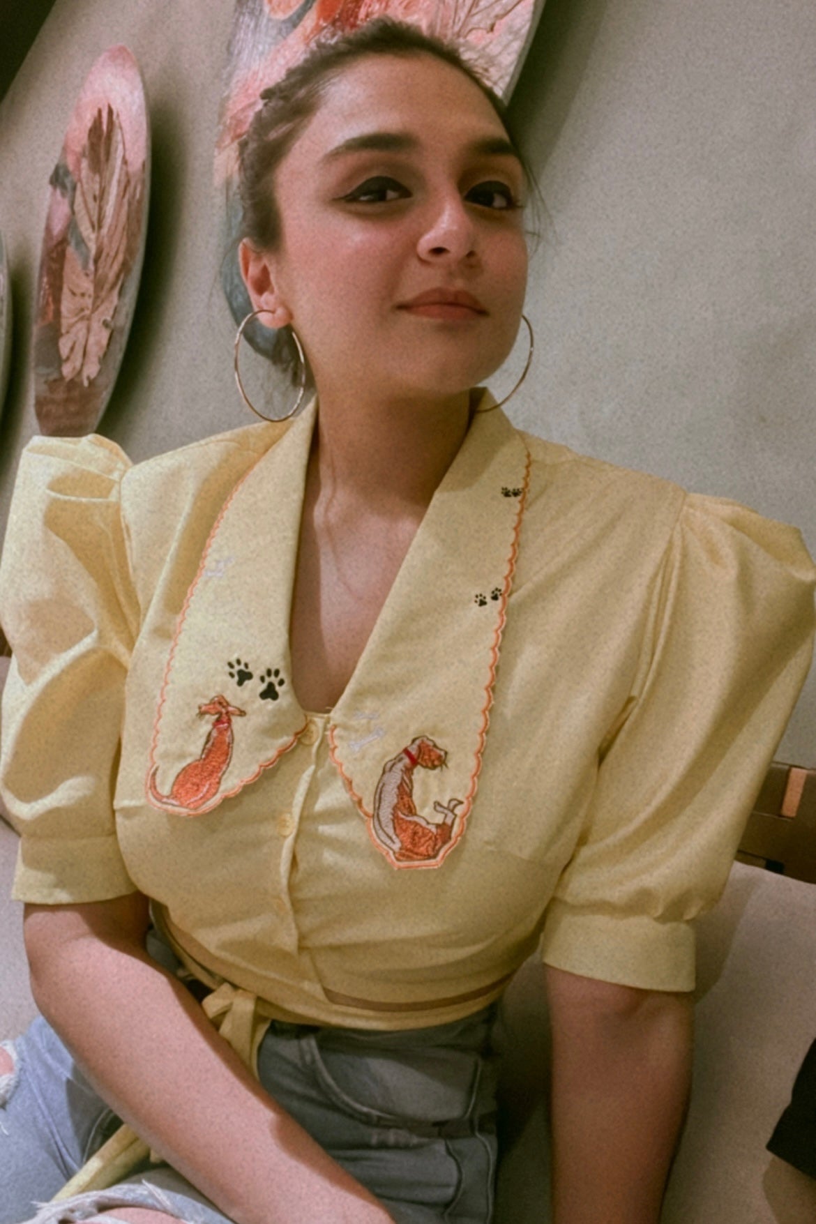 This super trendy top has Puffed Sleeves, Flossing at the Waist and Long Collars that can be personalized with your Initials. What you're seeing are the initials JG while giving an ode to Man's Best Friend.