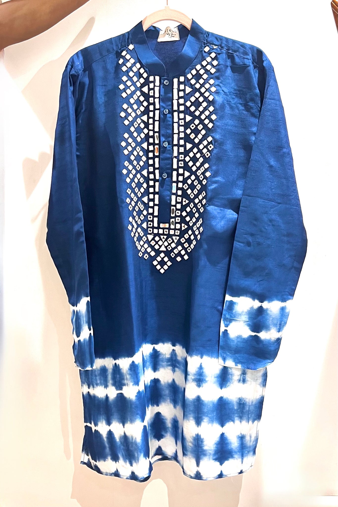 Diwan is a Silk Blended Tie and Dye Kurta with Mirror Work Embroidery Around the Neck and Placket. It is paired with a White Patiala Salwar. You can also have it swapped with Chudidaar or Pants.