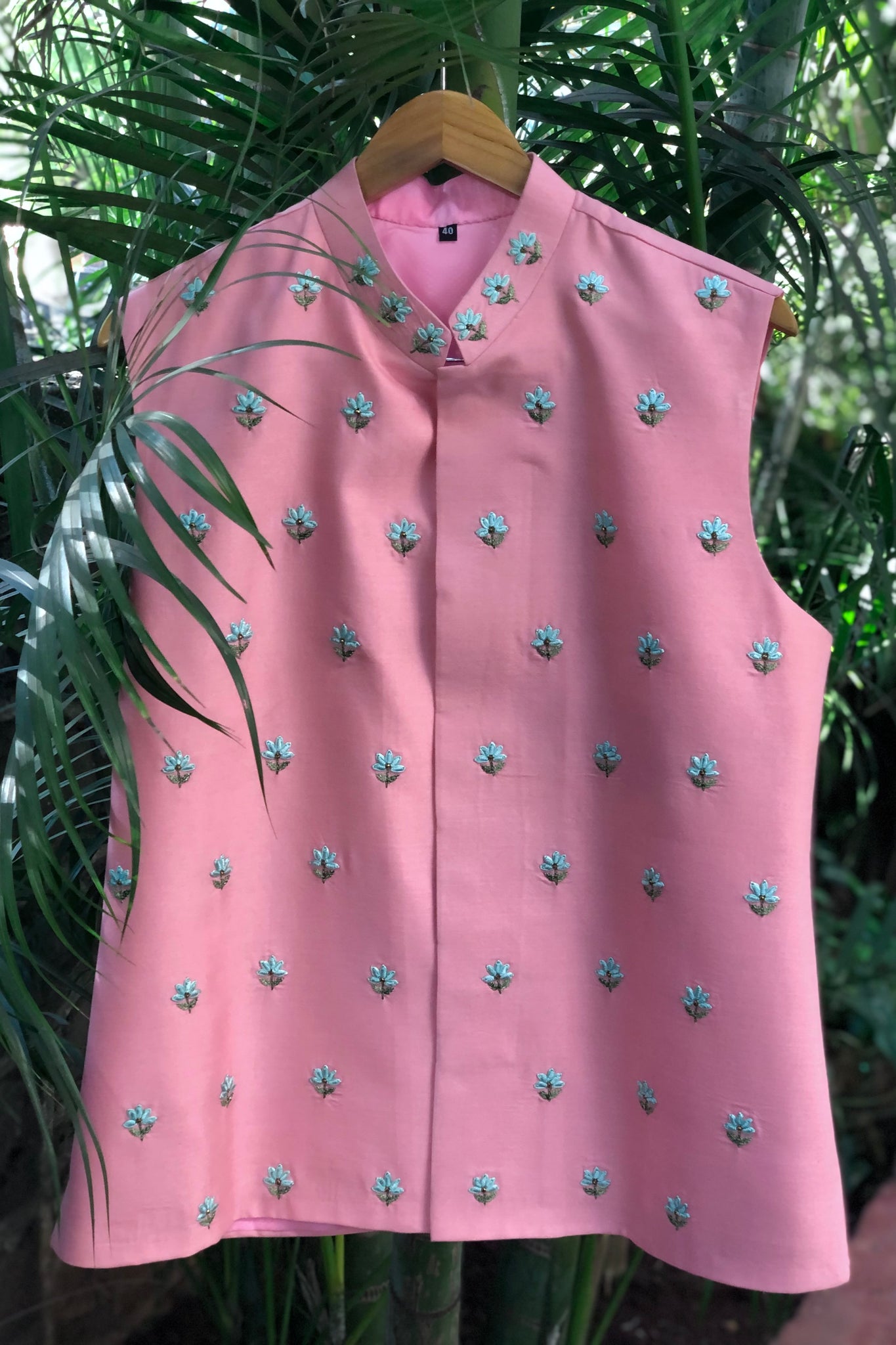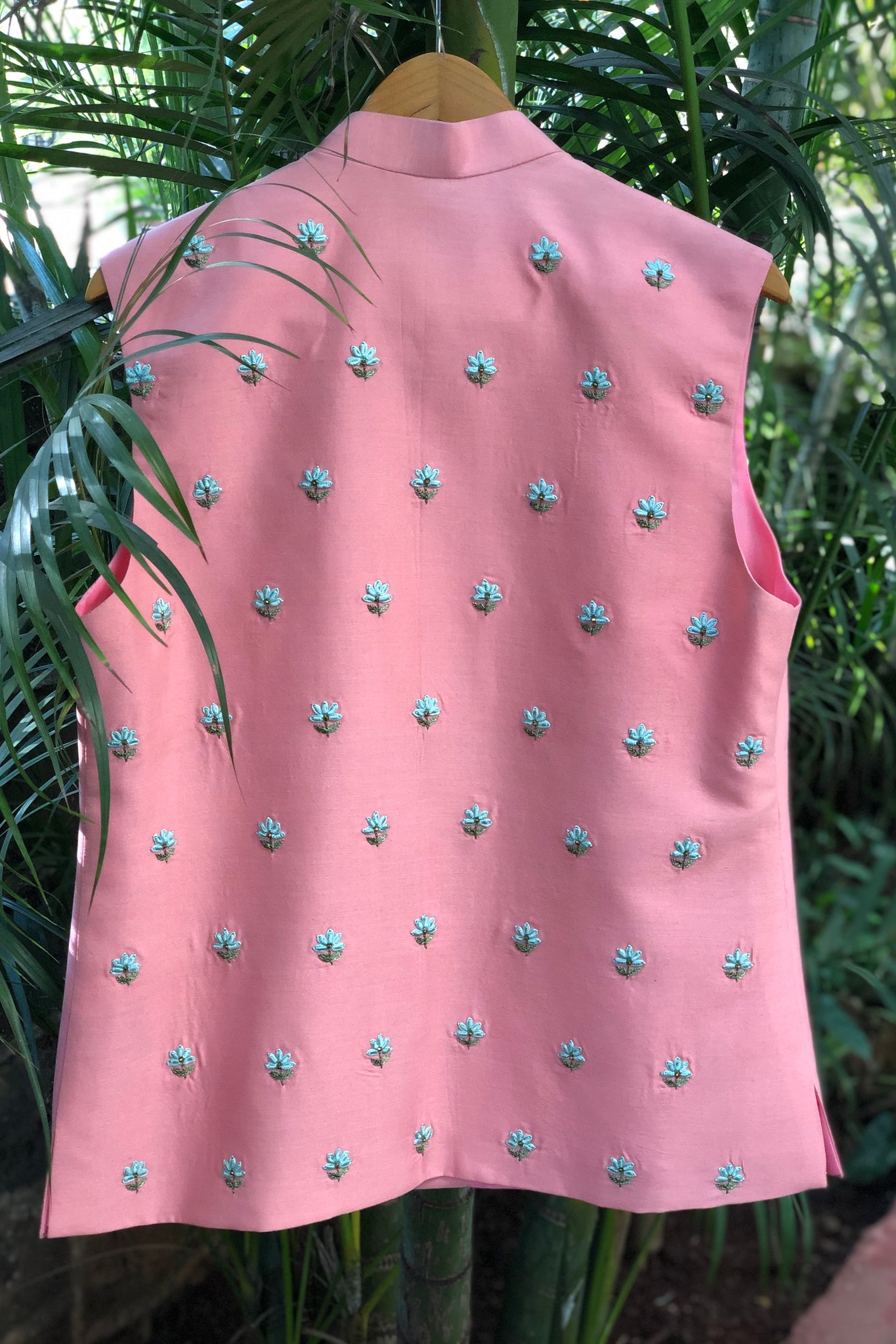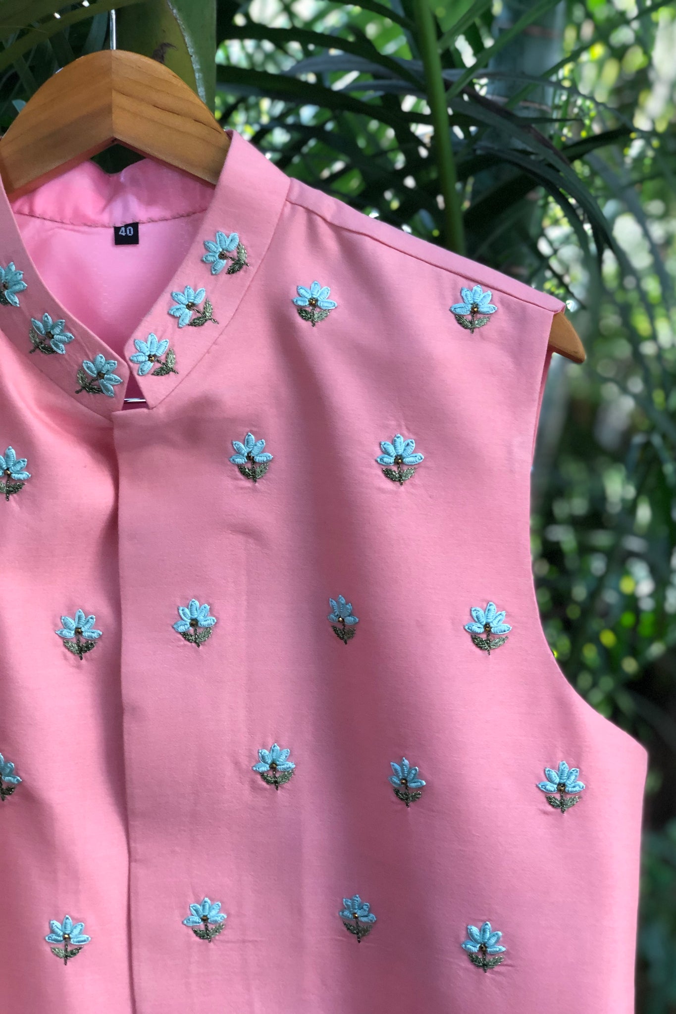 The Pink Forget-me nots Bandi has Thread and Beaded Embroidery in the front and the back of the Bandi.
