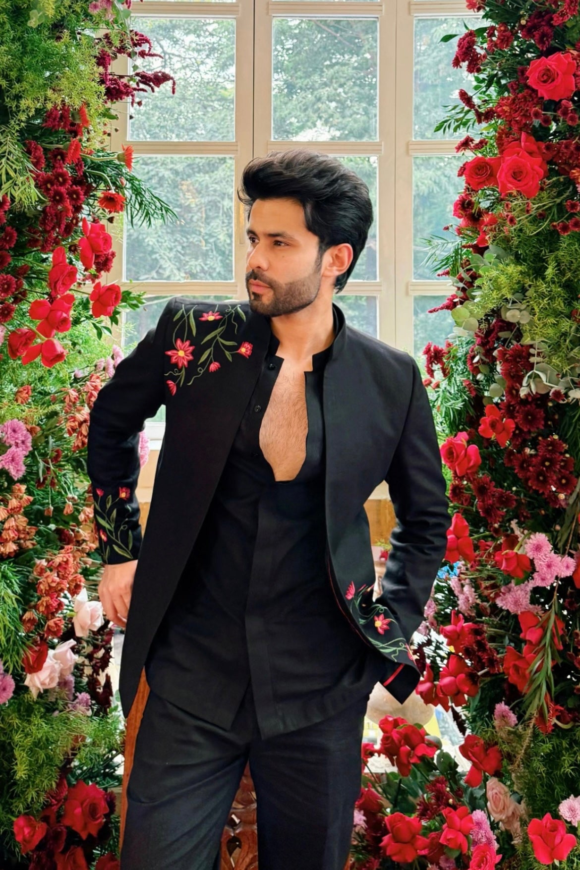 The Bandhgala has a floral embroidered hemline, cuff and shoulder it is paired with an inner shirt kurta and trousers