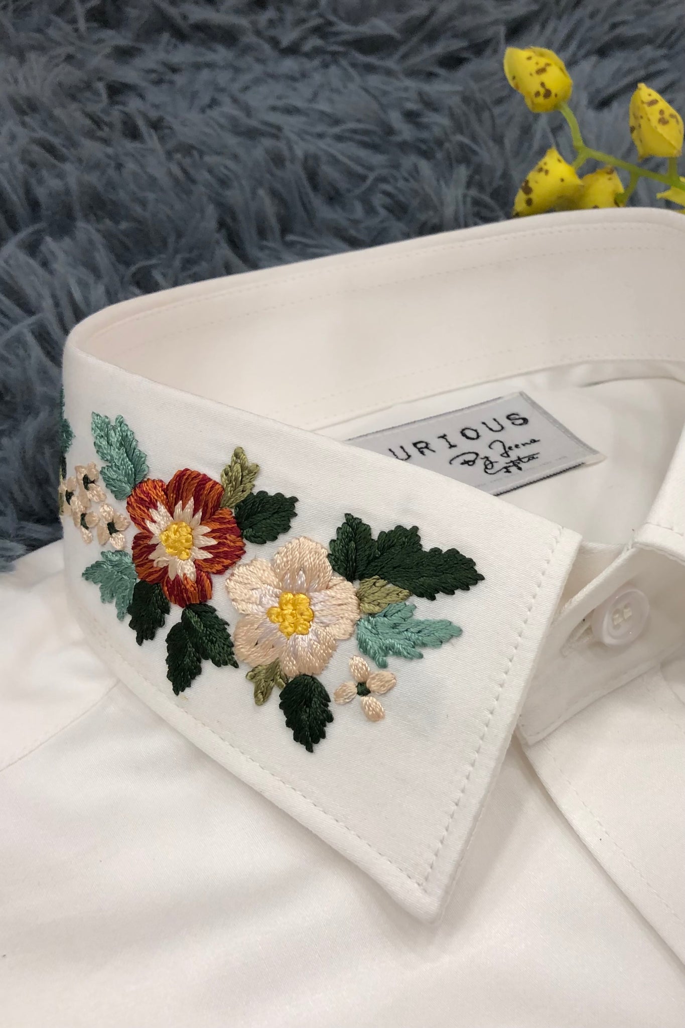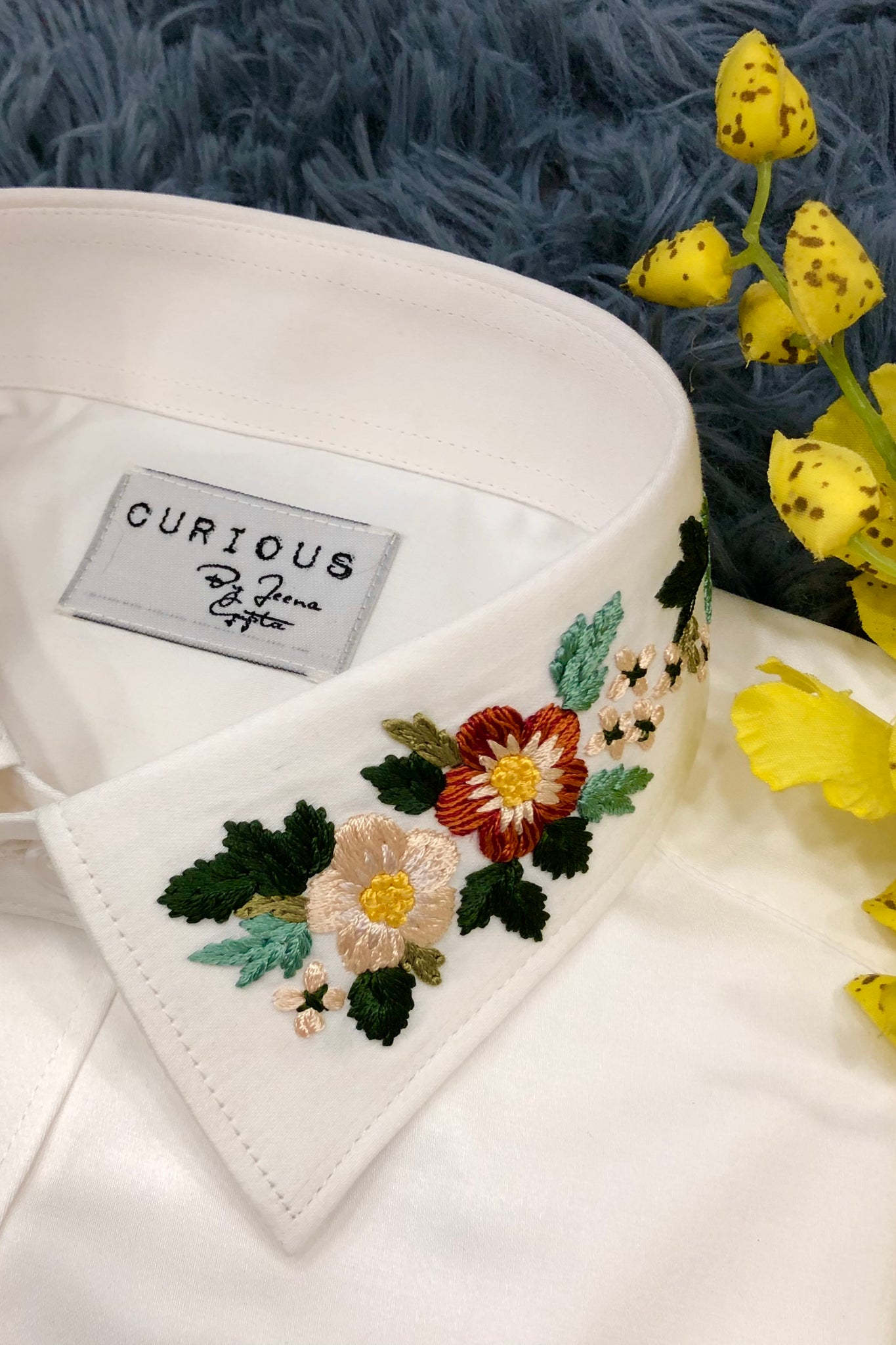 White, Full Sleeves, Hand Embroidered Collar, No Pockets, Apple Cut Hemline