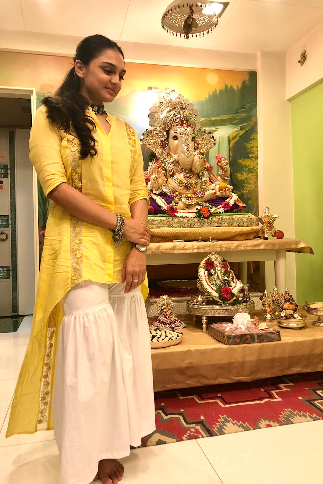 Our Canary Yellow Vines Kurta is paired with White Sharara pants.